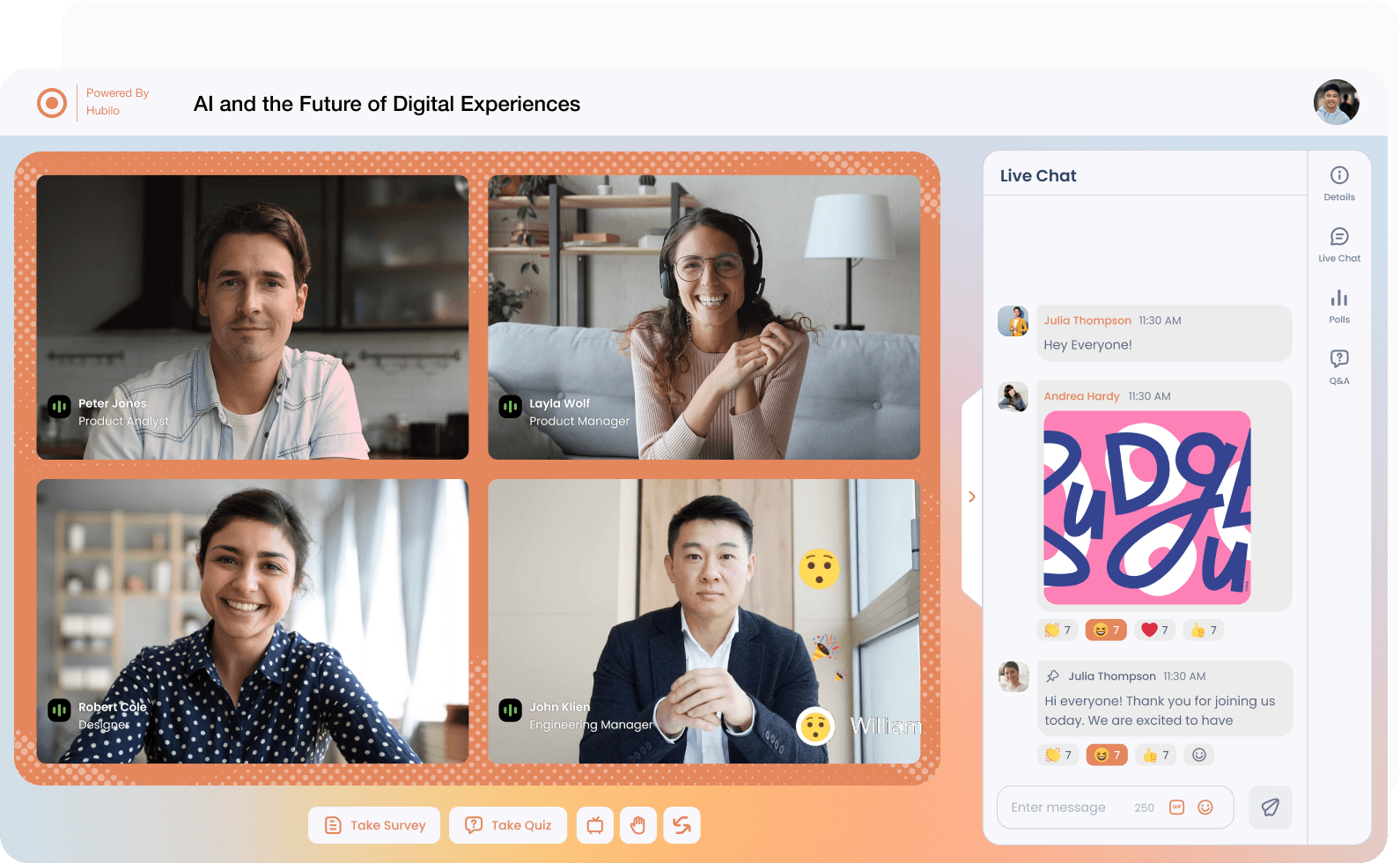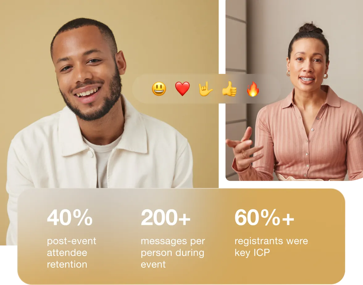 Webinar+ has industry leading engagement features to keep audiences hooked. Create meaningful interactions with live video-interactive polls, Q&A, chats, reactions, and conversion prompts to boost engagement. It’s time to move beyond basic, repetitive webinars to immersive experiences.